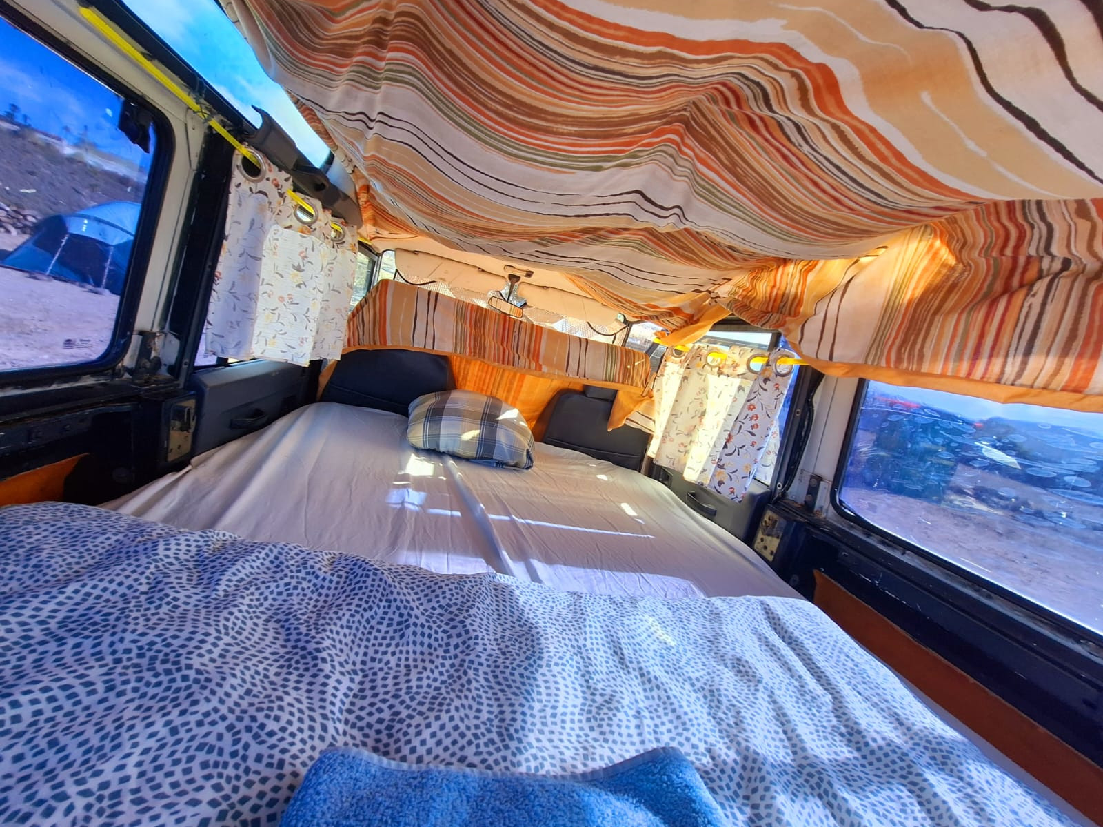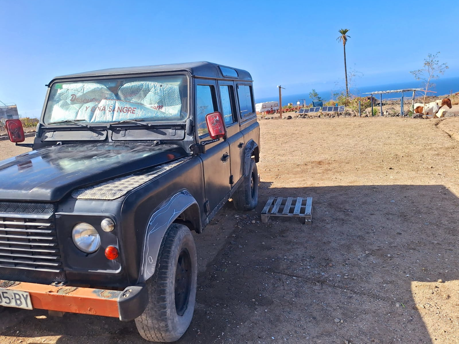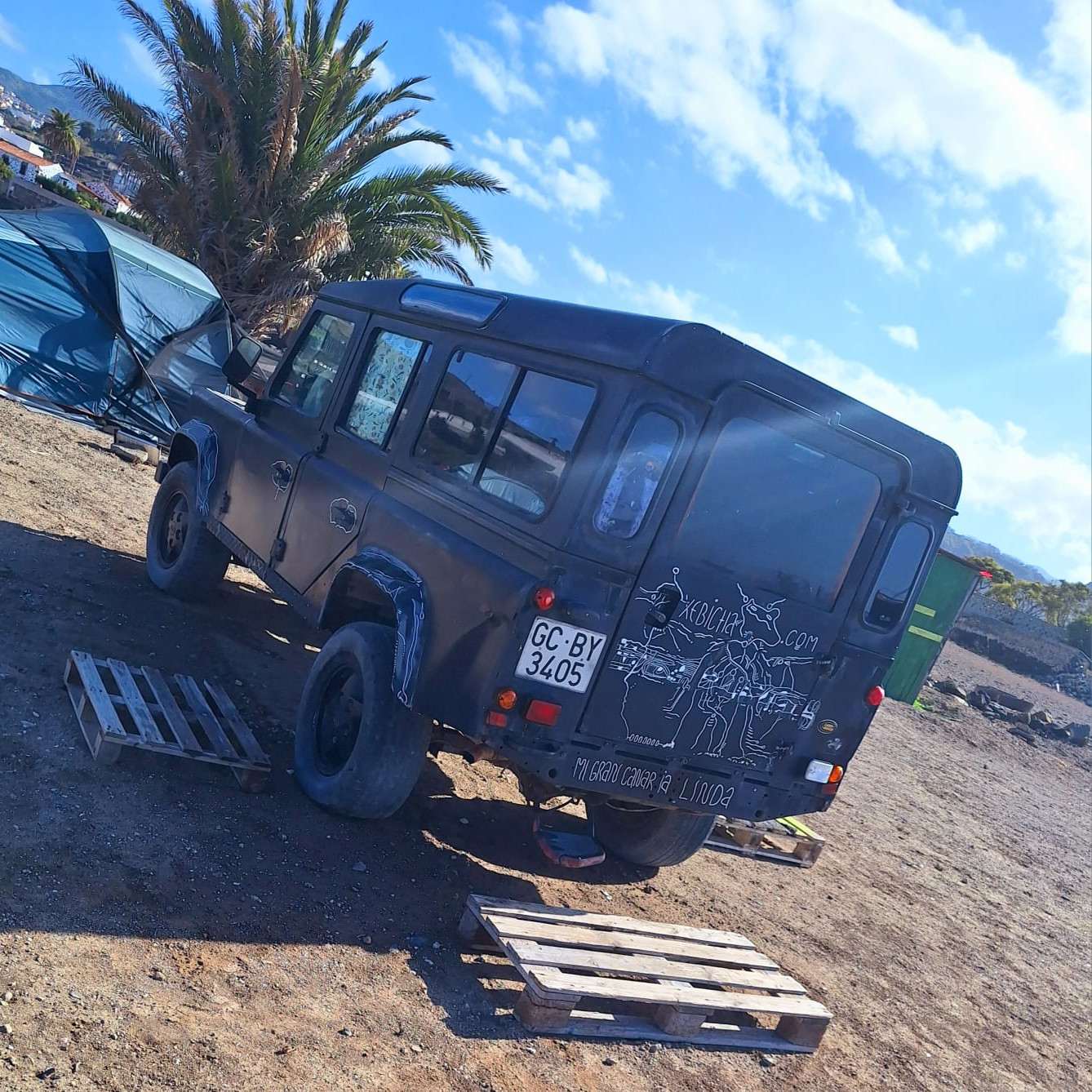 The Land Rover Defender has a double bed inside, with a view towards the ocean and 2nd highest palm tree on the Canary Islands.
