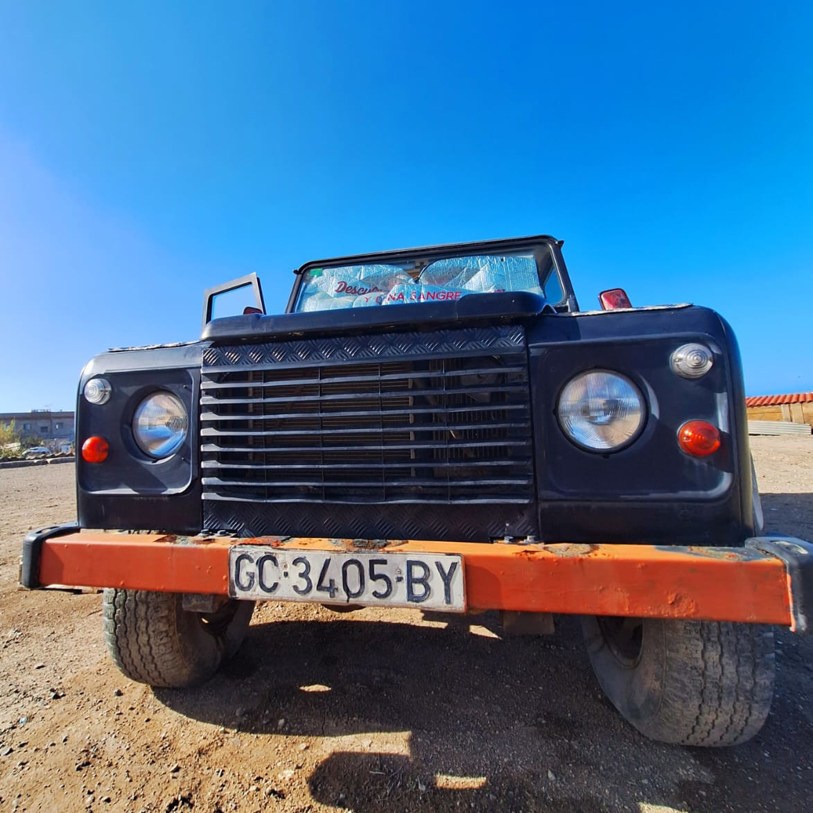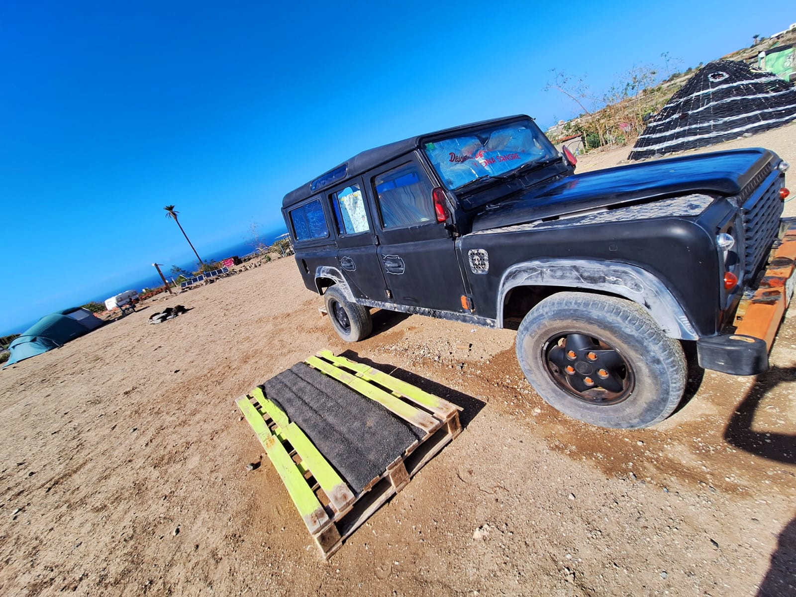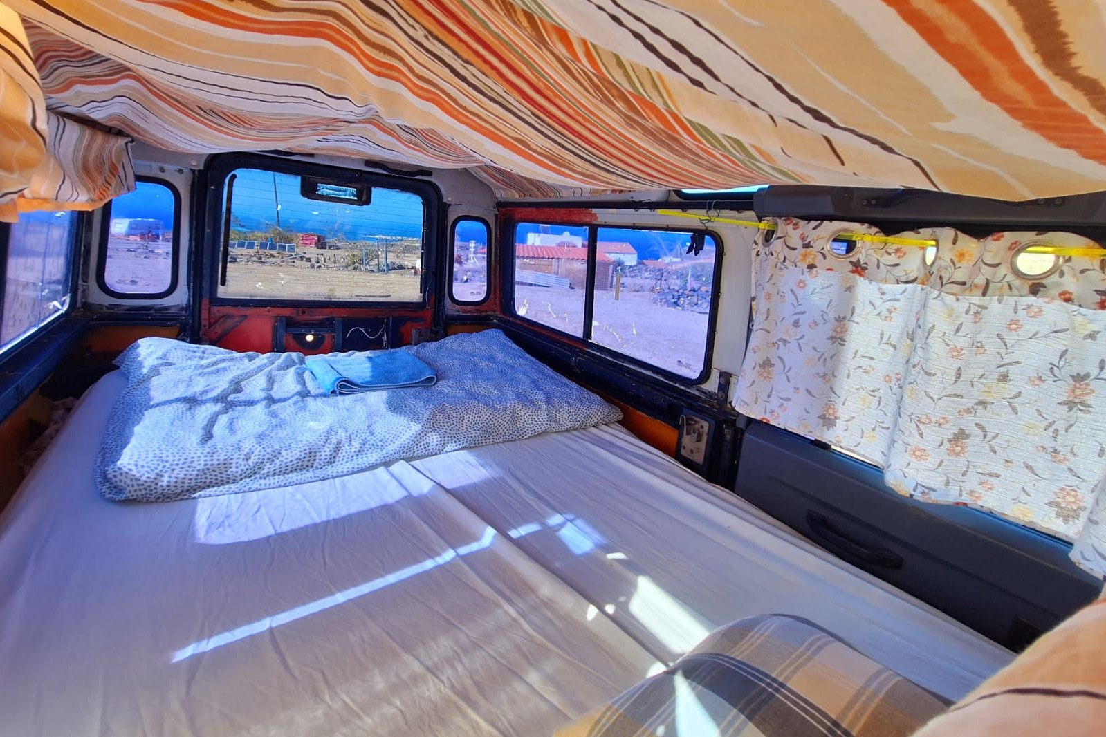 The Land Rover Defender has a double bed inside, with a view towards the ocean and 2nd highest palm tree on the Canary Islands.