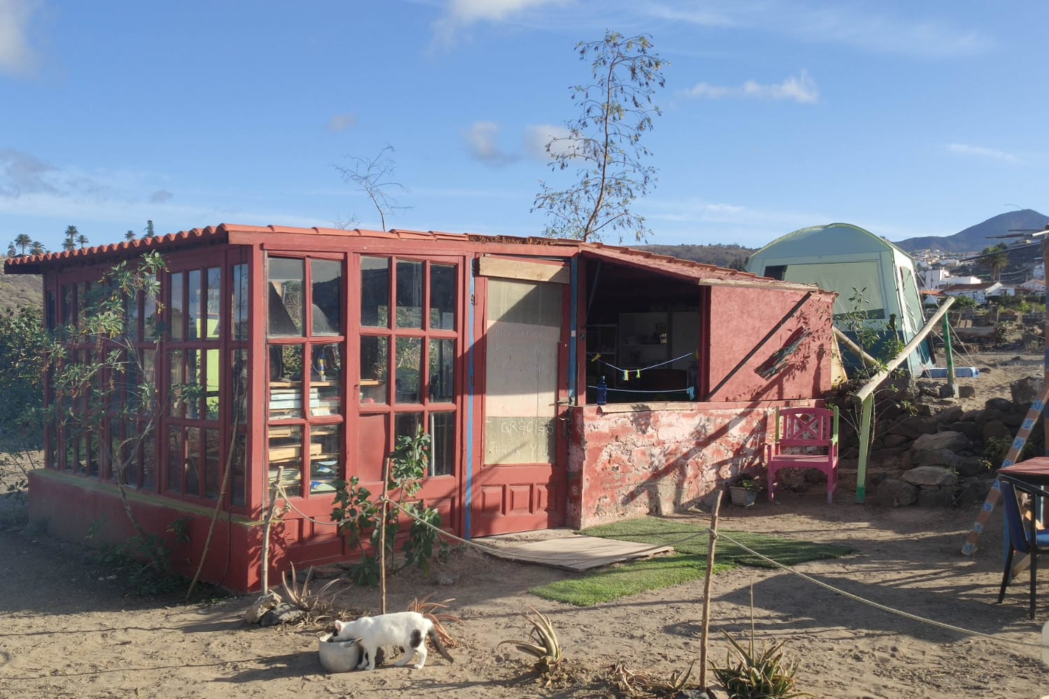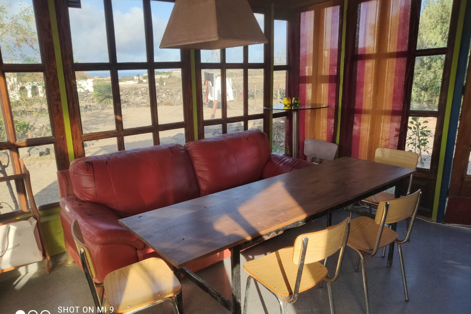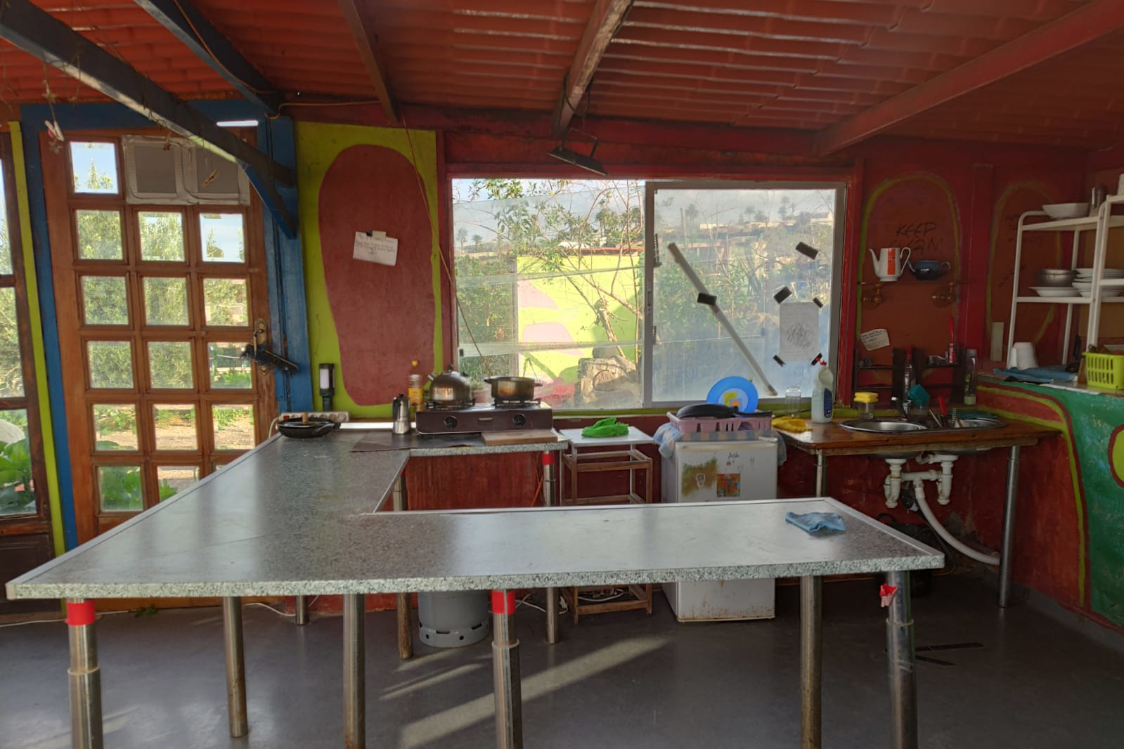 A big kitchen with a gas cooker, a dining table, a couch, and a small fridge.